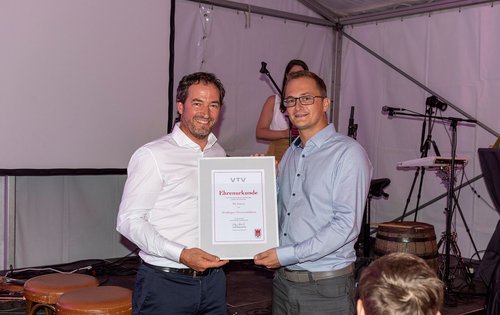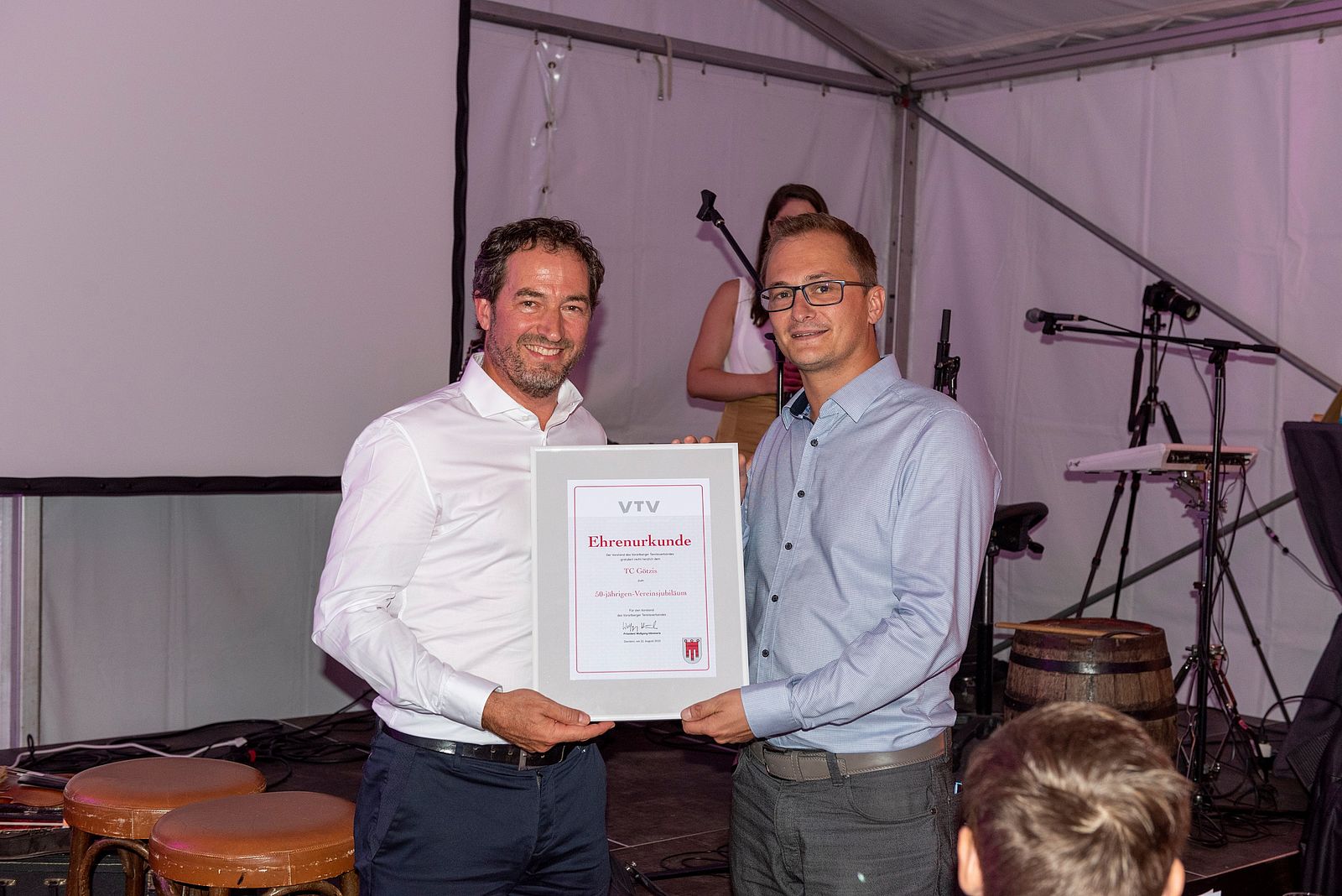 Um 18:00 wurden die Gäste mit einem Gin-Apero begrüßt. Nach dem Begrüßungsdrink nahmen die Gäste ihren Platz im Festzelt ein. Ab 19:00 führte Dunja Ellensohn gekonnt durch ein abwechslungsreiches und kurzweiliges Programm. Zwischen den einzelnen Programmpunkten, u.a. jeweils kurze Reden von Ehrenpräsident Arthur Schneider und VTV-Präsident Wolfgang Hämmerle, verwöhnte das Team von Olympia-Caterer Ernst Seidl die Weggefährten des TC Götzis in den letzten 50 Jahren mit einem köstlichen Menü. Musikalisch untermalt wurde der Abend mit super Sound der „All Right Guys“.
