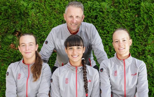 Österreichs erfolgreiches Team. Hinten: ÖTV-U14-Nationaltrainer Franz Kresnik. Vorne von links nach rechts: Anna Pircher, Kara Fronek, Lea Haider-Maurer.